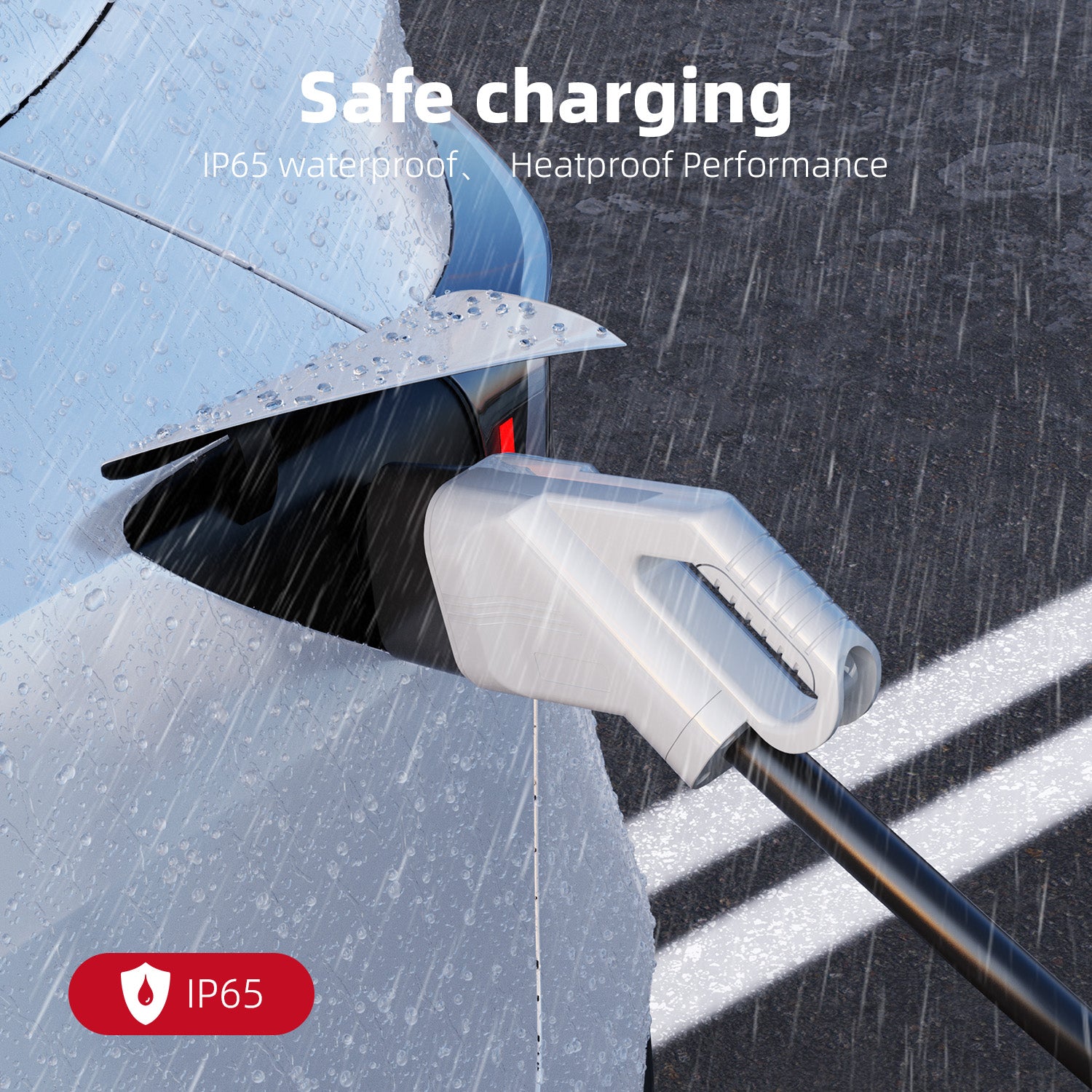 Easy to plug in and charge, the Tesla adapter is designed for harsh weather conditions and can operate stably in environments ranging from -22 ° F to 122 ° F, ensuring safety and reliability even in extreme conditions such as thunderstorms, high temperatures, or blizzards.The Tesla plug adapter has an IP65 waterproof rating and high flame retardancy, which can withstand all weather conditions, is fire-resistant, and very durable.