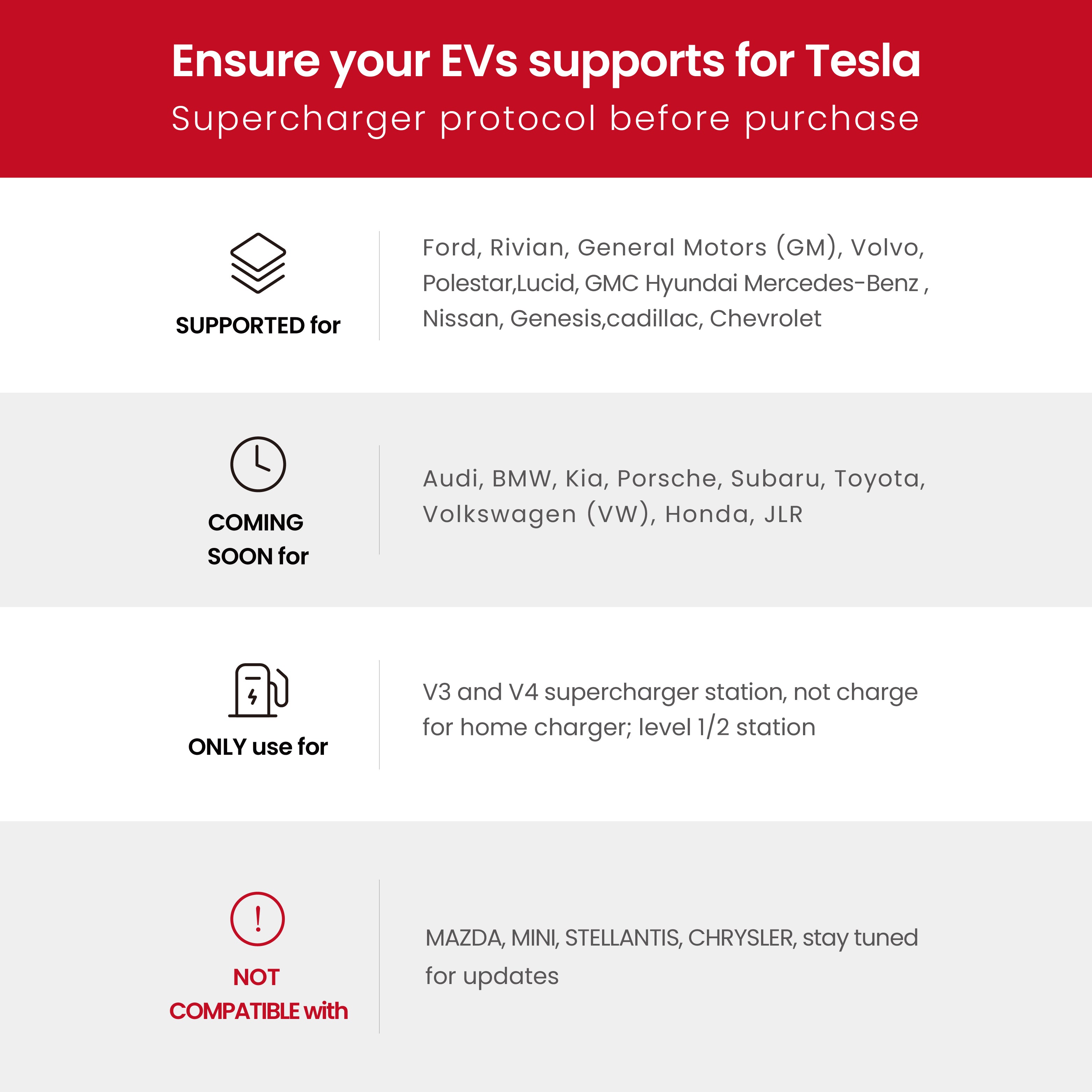 SUPPORTED for Ford, Rivian, General Motors (GM), Volvo, Polestar, Lucid, Hyundai, Mercedes-Benz ,Nissan, Genesis(Please upgrade to Tesla Supercharger protocol before use). ACCESS COMING SOON for Audi, BMW, Kia, Porsche, Subaru, Toyota, Volkswagen (VW), Honda, JLR. CURRENTLY NOT COMPATIBLE with MAZDA, MINI, STELLANTIS, CHRYSLER, stay tuned for updates