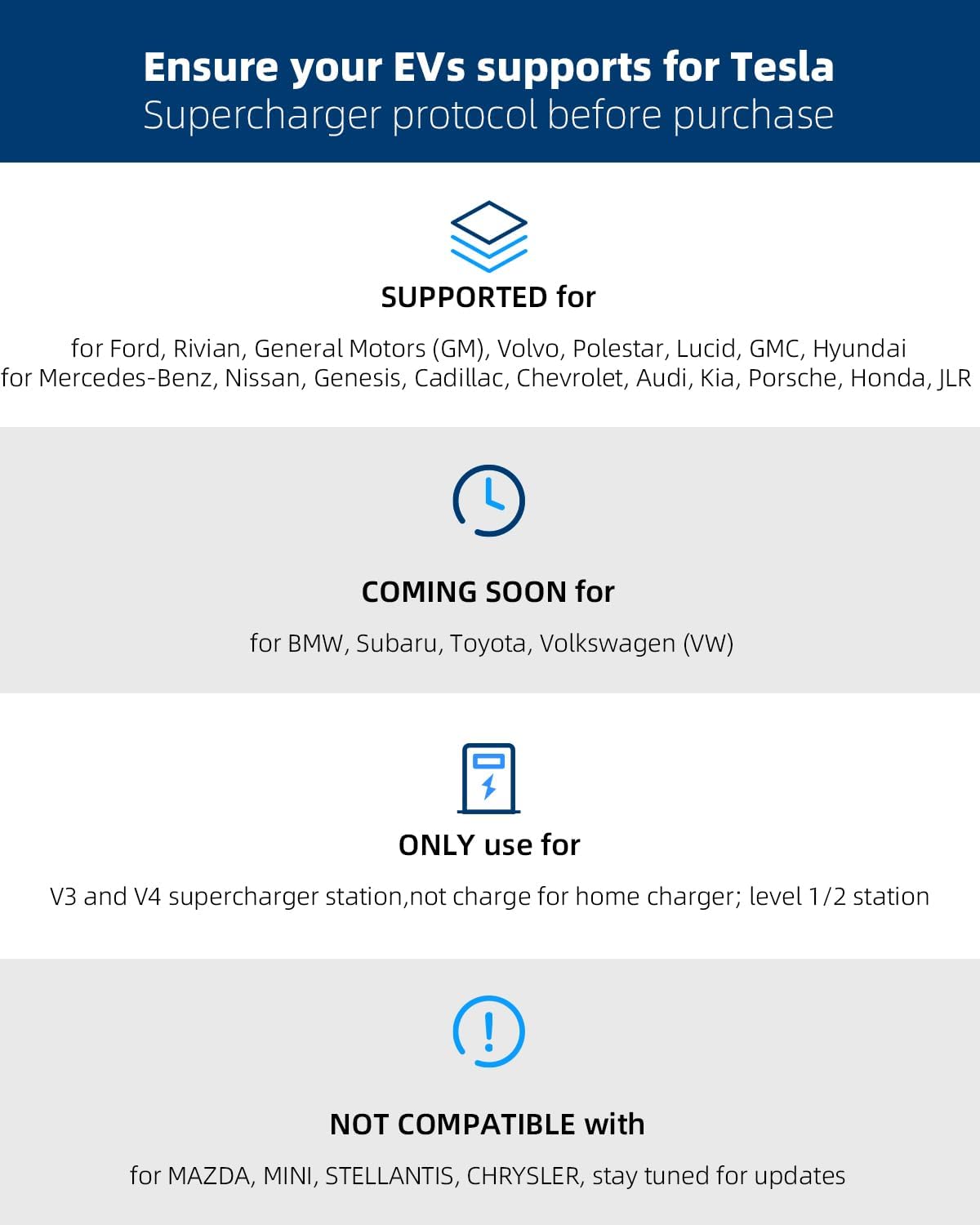 SUPPORTED for Ford, Rivian, General Motors (GM), Volvo, Polestar, Lucid, Hyundai, Mercedes-Benz ,Nissan, Genesis(Please upgrade to Tesla Supercharger protocol before use). ACCESS COMING SOON for Audi, BMW, Kia, Porsche, Subaru, Toyota, Volkswagen (VW), Honda, JLR. CURRENTLY NOT COMPATIBLE with MAZDA, MINI, STELLANTIS, CHRYSLER, stay tuned for updates